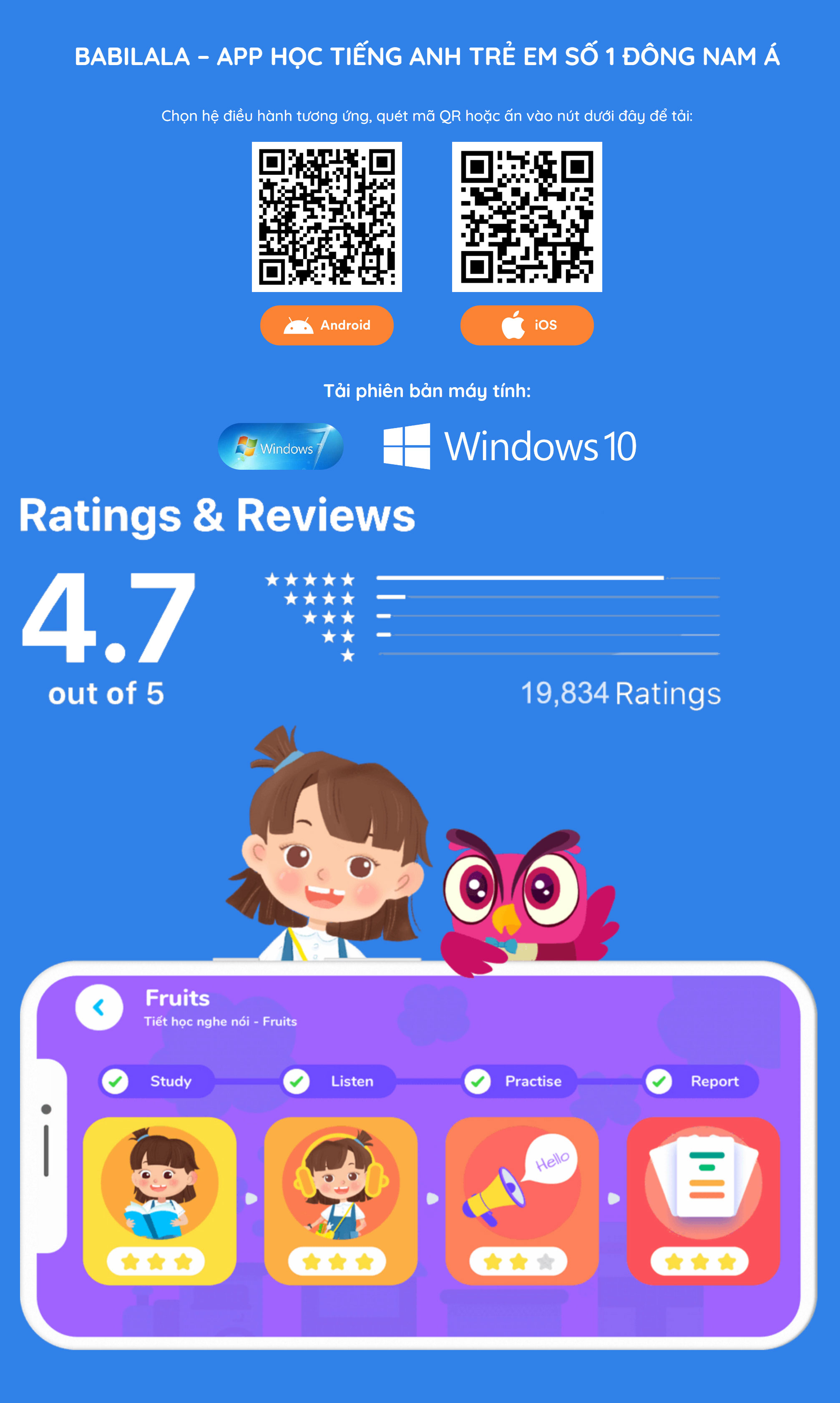 Được thiết kế khoa học bởi các chuyên gia giáo dục sớm Việt Nam và Quốc tế, gắn liền với tiêu chuẩn ngôn ngữ Châu Âu CEFR. Phù hợp với trẻ giai đoạn mẫu giáo, từ 3 đến 8 tuổi. Babilala sẽ là bước khởi đầu vững chắc cho bé trong việc tiếp cận với tiếng Anh trên lớp sau này.