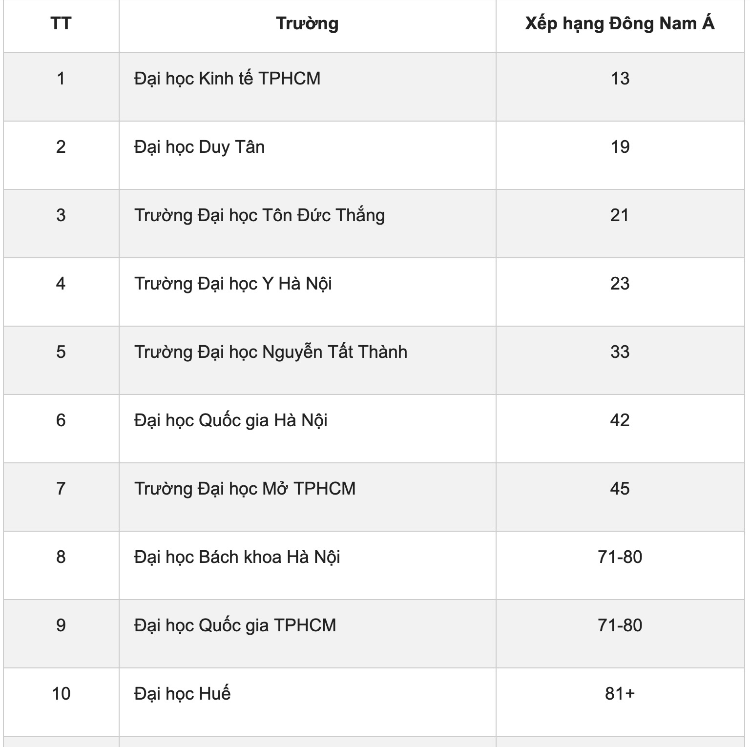Trong bảng xếp hạng này, Việt Nam có 11 cơ sở giáo dục đại học góp mặt. Trong đó, Đại học Kinh tế TP.HCM có thứ hạng cao nhất khi đứng thứ 13, tiếp theo là Đại học Duy Tân ở vị trí thứ 19.