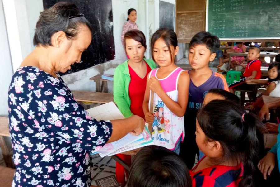 Cô giáo Son phát sách tập, dụng cụ học tập cho các em nhờ sự hỗ trợ của những học trò cũ.