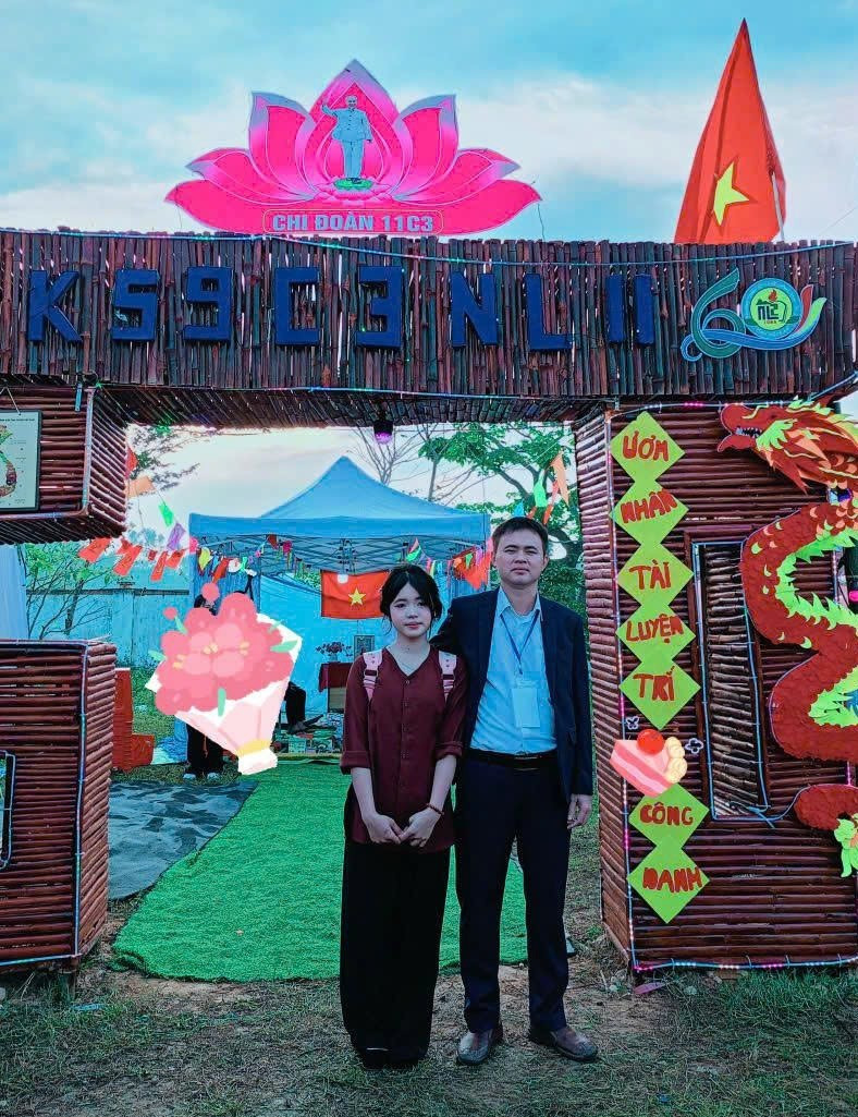 Em Hà với thầy giáo chủ nhiệm trong hội trại 60 năm thành lập trường.