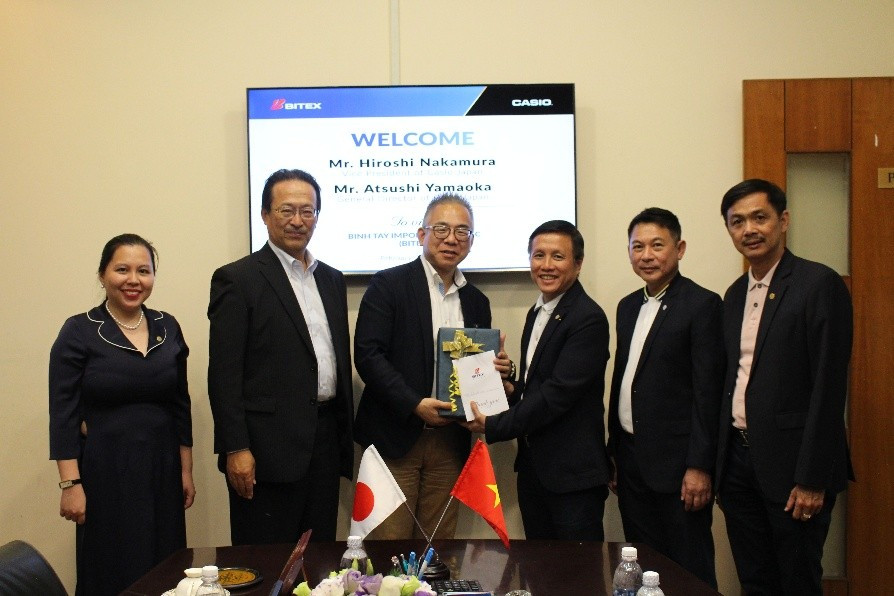 Chị Trần Thanh Thảo cùng ông Nguyễn Xuân Dũng – Chủ tịch HĐQT BITEX Group đón lãnh đạo Tập đoàn CASIO sang thăm BITEX