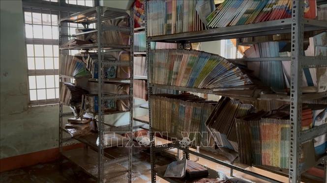 Phòng thư viện của một trường học ở Đắk Lắk bị ngập nước, sách vở hư hỏng hoàn toàn. Ảnh : Nguyên Dung - TTXVN