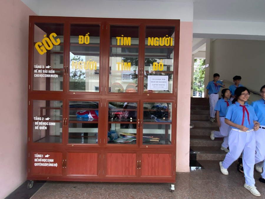 Chiều muộn ngày cuối thu, sân Trường THCS Lê Quý Đôn (phường Lào Cai, tỉnh Lào Cai) rộn rã tiếng nói cười của học sinh sau giờ tan lớp. Giữa lối cầu thang dẫn lên tầng học, một chiếc tủ gỗ nhỏ được đặt gọn gàng, trên đó là tấm bảng ghi dòng chữ nổi bật: Góc "Đồ tìm người - Người tìm đồ”.