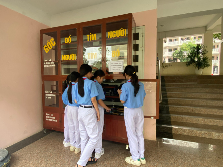 Theo Giáo dục thời đại - Giữa lối cầu thang của Trường THCS Lê Quý Đôn, chiếc tủ gỗ nhỏ nổi bật cùng tấm bảng ghi dòng chữ: “Góc Đồ tìm người - Người tìm đồ”.