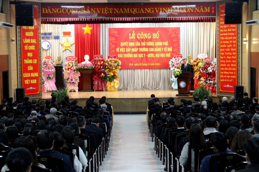 Ngày 22/11, Trường Đại học Y - Dược, Đại học Huế (ĐH Y Dược Huế) tổ chức Lễ Công bố Quyết định của Thủ tướng Chính phủ về việc sáp nhập Trường Cao đẳng Y tế Huế vào nhà trường theo Quyết định số 2346/QĐ-TTg ngày 23/10/2025 của Thủ tướng Chính phủ.