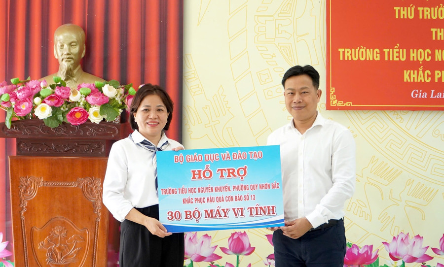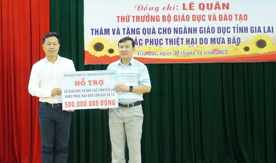 Thay mặt Bộ GD&ĐT, Thứ trưởng Lê Quân trao hỗ trợ 500 triệu đồng cho Sở GD&ĐT Gia Lai để khắc phục hậu quả bão, lũ.