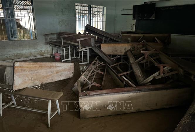 Bàn ghế, thiết bị vi tính, âm thanh của trường Trung học cơ sở Lương Thế Vinh, phường Tây Nha Trang, bị nước lụt ngâm ướt toàn bộ. Ảnh: Phan Sáu - TTXVN.