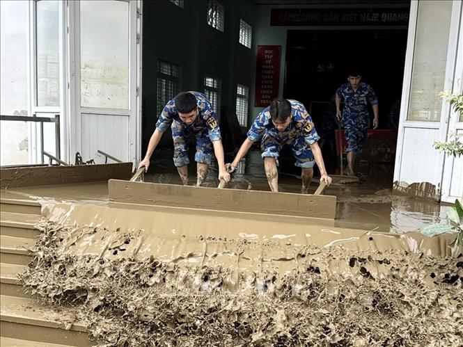 Lực lượng quân đội hỗ trợ các trường học dọn dẹp bùn non sau khi nước rút ở phường Tây Nha Trang, tỉnh Khánh Hòa. Ảnh: Phan Sáu - TTXVN.