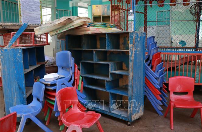 Thiết bị dạy học của các trường mầm non đến thời điểm hiện tại vẫn chưa được dọn dẹp xong. Ảnh: Phan Sáu - TTXVN.