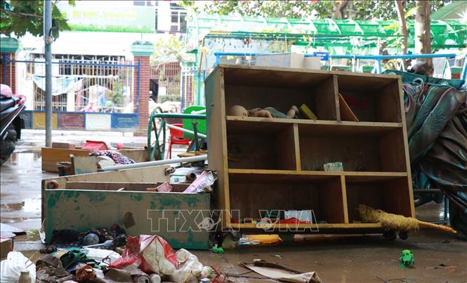 Trường Mầm Non Vĩnh Thạnh, phường Tây Nha Trang, vẫn còn ngổn ngang vật dụng dạy học sau lũ lụt. Ảnh: Phan Sáu - TTXVN.