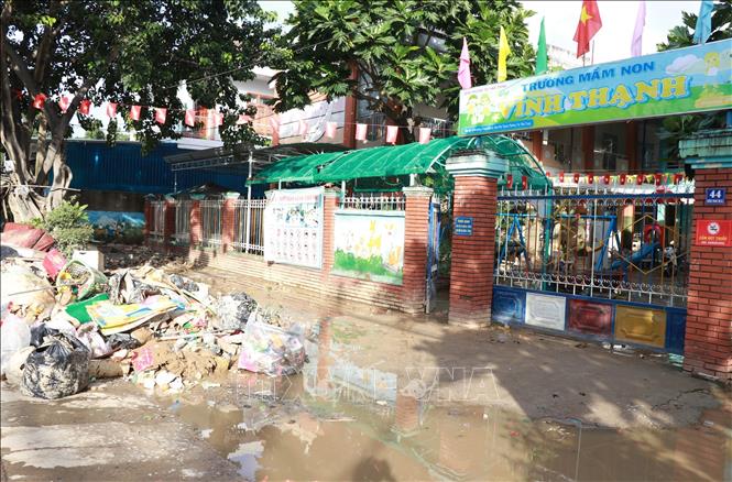 Ghi nhận của phóng viên TTXVN tại Trường Mầm non Vĩnh Thạnh (phường Tây Nha Trang) sáng 25/11, các giáo viên toàn trường vẫn đang dọn dẹp. Sau khi được bộ đội hỗ trợ, đến sáng 25/11, trường vẫn ngổn ngang với nhiều vật dụng, đồ chơi dính đầy bùn đất. Dự kiến trong tuần này, các cô giáo tiếp tục tổng lực làm vệ sinh, đảm bảo trường lớp an toàn để đón trẻ quay trở lại học.