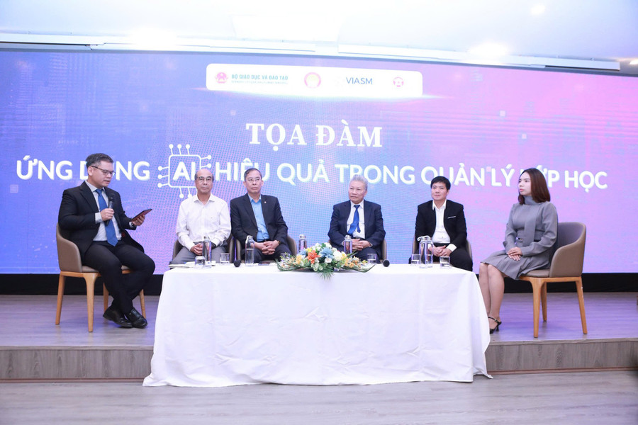 Tọa đàm “Ứng dụng AI hiệu quả trong quản lý lớp học” được tổ chức với sự tham gia của các chuyên gia và nhà quản lý giáo dục hàng đầu như GS.TSKH Hồ Tú Bảo, Giám đốc PTN Khoa học Dữ liệu, VIASM; TS Vũ Minh Đức, Cục trưởng Cục Nhà giáo và Cán bộ Quản lý Giáo dục; TS Nguyễn Hồng Sơn, Phó Chủ tịch Hội Khuyến học Việt Nam; GS.TS Lê Anh Vinh, Viện trưởng Viện Khoa học Giáo dục Việt Nam (VNIES); Th.s Chu Hải Yến, Giáo viên Trường THCS Ngoại Ngữ, Trường ĐH Ngoại ngữ và TS Đỗ Ngọc Minh, The Vietnam Foundation.